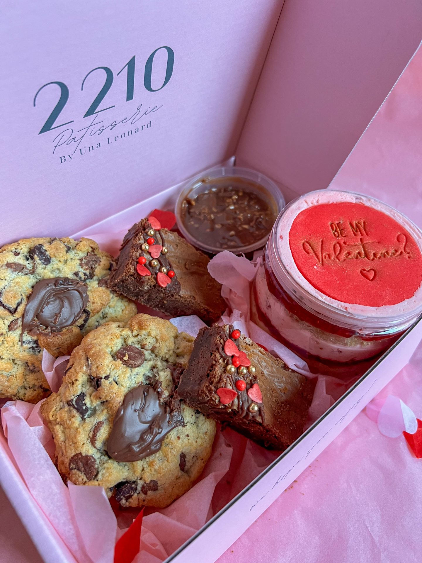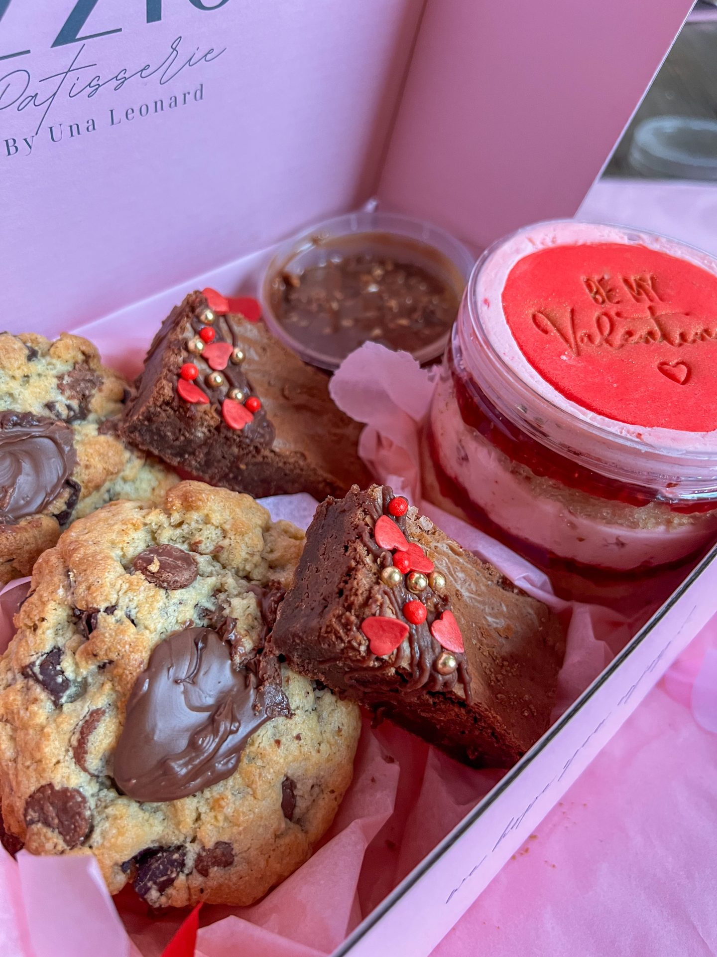 A perfect Valentine’s night-in treat box featuring two Nutella cookies, two brownies, a Ferrero Rocher dipping sauce and a raspberry ganache & vanilla cake jar, the ultimate mix of indulgent chocolate and sweet romance. 💕🍫